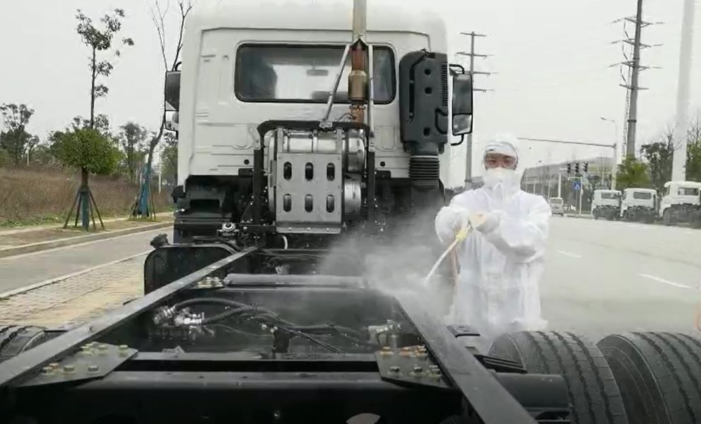 东风商用车生产基地在湖北十堰疫情重灾区,东风商用车的物流司机将底盘车送至湖南境内的高速路口岳阳北收费站后返回湖北集中隔离,再由leyu.乐鱼环境的物流司机接回厂区。整个交接运输过程中,每一辆底盘车在出厂、高速路口、leyu.乐鱼环境长沙园区必须经历三次的专业消毒,确保安全,万无一失。